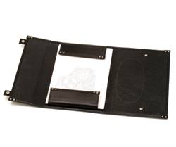 ハリのあるヴォーノアニリンを使用したハードタイプのメガネケース。カブセにはバック グラウンドを潰さず、スクロールを全面に押し出して構成されたオリジナル唐草カービン グにアクリルカラーで染色を施し、背面はバスケットスタンプで飾ります。